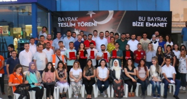 Törene katılan AK Parti Antalya İl Başkanı Av. Rıza, Sümer milletvekili Gökçen Özdoğan Enç ve İl Gençlik Kolları Başkanı Ömer Akbaş 81ilden 250 gencin Cumhurbaşkanı Recep Tayyip Erdoğan’a teslim edeceği Türk bayrağını Antalya’yı temsil edecek gençlere emanet etti.