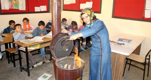 Ayşe öğretmen odun topluyor, sobayı yakıyor, sınıfları temizliyor