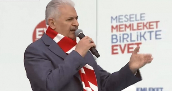 Başbakan Binali Yıldırım Türkiye'nin saldırılarla ve tuzaklara karşı karşıya kaldığına dikkat çeken Yıldırım, "Tıpkı 1. Dünya Savaşı'nda olduğu gibi Türkiye'yi dize getirmek, istikametini çizmek isteyenler, karanlık bir oyun peşinde. Kimi zaman bölücü terör, kimi zaman kardeş kavgası, kimi zaman ekonomik krizlerle Türkiye'nin yolunu kesmek istiyorlar. Cumhurbaşkanımıza suikast planları yapıyorlar. Hükümeti yok etmeye çalışıyorlar. Milletin meclisinin üzerine bombalar yağdırıyorlar. Başaramadılar, başaramayacaklar. Ne çukur kazanlar, ne de Pensilvanya'nın alçak FETÖ örgütü milletin yolunu kapatamayacak. Allah'ın yardımı ve milletin desteği ile millet iradesine yönelerek her türlü saldırıyı püskürttük. Halkın tercihini sindiremeyenlere karşı dik durduk, demokrasiyi koruduk. Terör örgütleri üzerinden ülkemize yönelen saldırıları birer birer boşa çıkardık. Terör örgütler ile tavizsiz mücadelemiz devam ediyor. Bu şer odakları ile daha da güçlü mücadele için 16 Nisan bir milat olacak. Sandıktan çıkan her 'evet' ile Türkiye gücüne güç katacak. Her 'evet', şer odaklarının hesabını bozacak" ifadelerini kullandı.