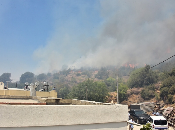 Muğla’nın Bodrum ilçesinde makilik alanda başlayan ve ardından tarım arazilerine sıçrayan yangın yerleşim alanlarına doğru ilerliyor.