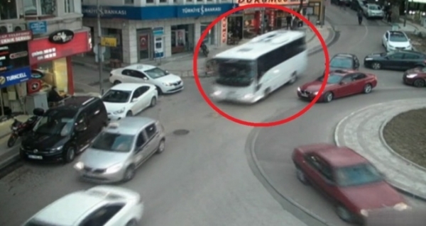 Merkez Osmangazi ilçesi Çekirge Meydanı'ndaki dehşet verici kaza saniye saniye kameraya yansıdı. Uludağ Caddesi'nden inerken frenleri patlayan midibüs korna çalarak araçların uzaklaşmasını istedi. Önce kaldırımdaki bir kişiyi teğet geçen sürücü büyük bir ustalıkla kavşaktaki diğer araçları teğet geçerek midibüsü yeniden kavşak içine almaya çalıştı.