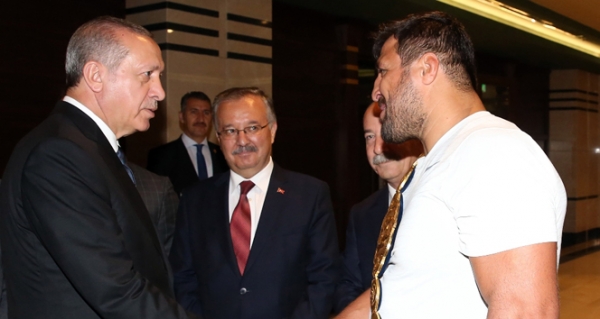 Cumhurbaşkanı Erdoğan, heyetten bugün başlayan organizasyon hakkında bilgiler alırken, aynı zamanda dört defa başpehlivan olan Recep Kara’ya da başarılar diledi.