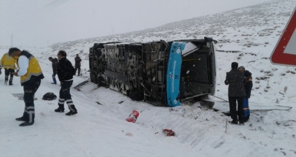 Erzurum’un Çat ilçesinde karlı yolda kayan özel halk otobüsü yan yattı. Kazada 2’i polis 18 kişi yaralanırken kaza mahalinde adeta can pazarı yaşandı.