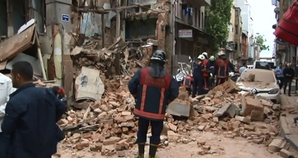 Polis ekipleri ise güvenlik şeridi çekerek, çevrede güvenlik önlemi aldı. Enkazı kaldırmak üzere olay yerine dozer getirilirken, ekiplerin çalışmaları devam ediyor. Bir bölümü hala ayakta olan binanın çökme tehlikesi de devam ediyor.