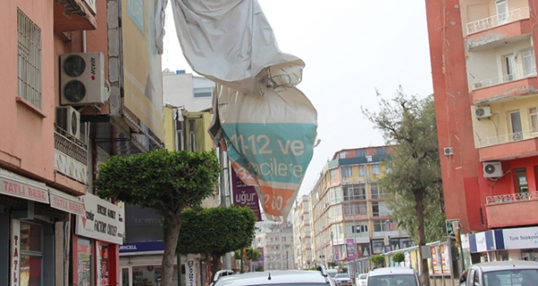 İskenderun’da dün geceden beri devam eden yer yer 60-90 kilometre hızdaki fırtına, reklam tabelalarının uçmasına, çatılardan parçaların düşmesine neden oldu.