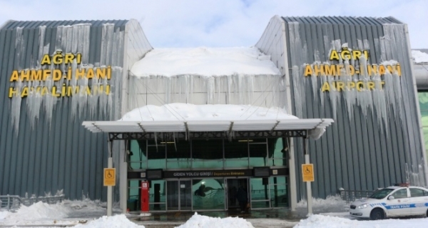 Ağrı Ahmed-i Hani Havalimanın çatısında eriyen kar suyunun duvarda akması sonucu metrelerce buz kütlesi oluştu. Duvarlardaki Ahmed-i Hani Havalimanı yazısını buz kütlesi kaplarken, bunu gören yolcular da şaşkınlık yaşadılar.