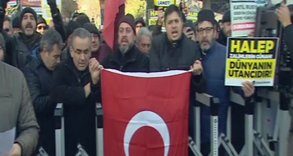 Suriye’nin Halep kentinde yaşanan sivillere yönelik saldırılar, İran’ın Ankara Büyükelçiliği önünde toplanan Ankara İnanç Özgürlüğü Platformu, İHH İnsani Yardım Vakfı, Memur-Sen ve Özgürder üyesi bir grup tarafından protesto edildi.