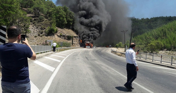 Ancak itfaiye ekiplerinin müdahalesiyle yangın kontrol altına alındı. Yangın nedeniyle yol bir süreliğine araç trafiğine kapandı.