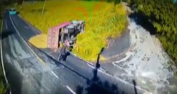 Güvenlik kameralarına yansıyan görüntülerde, kum yüklü kamyon sürücüsü sokağa giriyor. Sokakta ilerleyemeyen kamyon geri manevra yaparak caddeye çıkmak istiyor. Birkaç kez deneme yapan kamyon daha sonra genişten manevra yapıyor. Sürücü cadde üzerindeki boşluğu fark etmeyince kamyon devriliyor. Tam o esnada midibüs ise çarpışmadan kıl payı kurtuluyor. Devrilmenin etkisiyle kamyonun kasasındaki kumlar da yola saçılıyor.