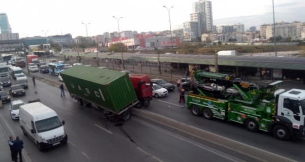 Haramidere mevkiinde yan şeritte ilerlediği sırada orta refüjden geçerek E-5’e giren tırın kupası trafiği durma noktasına getirdi.