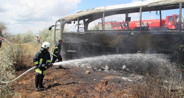 Kayseri’de sürücüsünün direksiyon hakimiyetini kaybetmesi sonucu ters şeride giren yolcu otobüsü şarampole yuvarlandı. Yolcular indikten sonra alev alan otobüs, kullanılamaz hale geldi.