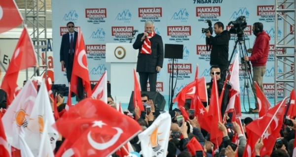 Başbakan Yardımcısı Mehmet Şimşek, Çevre ve Şehircilik Bakanı Mehmet Özhaseki, Gümrük ve Ticaret Bakanı Bülent Tüfenkci ve AK Parti Genel Başkan Yardımcısı Yasin Aktay ile birlikte toplu açılış törenine katılan Yıldırım, her zaman Hakkari’nin desteğini yanlarında gördüklerini belirterek, “Sizden hep güç aldık. Sizden aldığımız bu güçle Türkiye’nin dağ gibi sorunlarını dağ gibi hizmetlere dönüştürdük. Türkiye’nin dört bir yanını imar ettik, imar etmeye devam ediyoruz. Yüksekova’ya 4 bine yakın yeni bir konut yapıyoruz. Yüksekova’yı yeni baştan inşa ediyoruz. İnşallah kardeşlerim, 16 Nisan’da vereceğiniz güçlü, destekle daha çok iş yapacağız, daha çok güçleneceğiz. Türkiye’de demokrasi daha da gelişecek, özgürlükler daha da gelişecek, sizler daha da mutlu hale geleceksiniz. Hakkari, Yüksekova, Şemdinli hazır mıyız? 16 Nisan’a hazır mıyız? İstikrara devam mı? Kardeşliğe evet mi? Sağ olun. Allah sizden razı olsun” dedi.