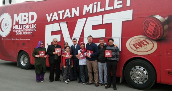Milli Birlik ve Düşünce Derneği (MBD) 16 Nisan Referandumu için 24 ilde, Almanya Bremen ve Hollanda Rotterdam’da ’Evet’ kampanyası sürdürüyor. MBD Genel Başkanı Erdem Ercan, Cumhurbaşkanı Erdoğan’a dernek çalışmaları ve ‘Vatan Millet Evet’ kampanyası hakkında bilgi verdi. Ziyaret sırasında Ercan’a, Başbakan Danışmanı ve Tekirdağ Milletvekili ile MBD Onursal Üyesi Özlem Yemişçi eşlik ederken, Ercan, Sakarya, Kocaeli, Bursa, Diyarbakır, Uşak ve Bolu başta olmak üzere 24 il ile Almanya ve Hollanda’da dernek şubeleri, stantlar ve seçim otobüsleri giydirerek, 16 Nisan Referandumunda sandıktan ‘Evet’ çıkması için kampanya yürüttüklerini ifade etti. 16 Nisan’ı Türk milleti için milad ve ‘Evet’i’ ülkenin bekası için şart gördüklerini belirten Ercan, "Cumhurbaşkanımız Erdoğan’ın şahsiyeti üzerinden Batı dünyası ve Avrupa’da Türk-İslam düşmanlığı yapılıyor . Oyunun farkındayız. Bu nedenle de milli ve manevi değerlere sahip dernek mensuplarımızla 45 gündür ülke genelinde ve Almanya ile Hollanda’da ‘Vatan Millet Evet’ temasıyla etkili bir ‘Evet’ kampanyası sürdürüyoruz" dedi.
