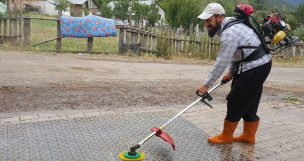 Özellikle temizlik sırasında halı ve kilimleri yıkamak için el fırçası kullanan ve saatlerce uğraşan kadınların imdadına ot biçme makineleriyle erkekler yetişti.