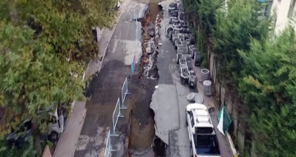 Sarıyer’de sağanak yağış sonrası ikiye ayrılan Nuripaşa Caddesi havadan görüntülendi.