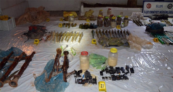 Şırnak Valiliğinden konuyla ilgili yapılan açıklamada, Silopi’de bir evin bodrumunda özel bir bölmede PKK/KCK terör örgütü tarafından gizlenmiş; 2 adet Bixi otomatik tüfek, 5 adet roket atar silahı, 6 adet AK-47 uzun namlulu silah ve çok sayıda mühimmatın ele geçirildiği bildirildi. Açıklamada, “Şırnak’ın Silopi ilçesinde bir ihbarı değerlendiren güvenlik kuvvetlerimizce Barbaros Mahallesinde bir evin bodrumunda özel bir bölmede PKK/KCK terör örgütü tarafından gizlenmiş; 2 adet Bixi otomatik tüfek, 5 adet roketatar silahı (RPG7), 6 adet AK-47 uzun namlulu silah, 3 adet anti tank mayını, 29 adet roketatar mühimmatı, 25 adet Luncher, 9 adet Luncher yuvası, 22 adet el bombası, 17 adet el bombasına ait fünye, 33 adet Roket sevk fişeği, 1 adet 40mm çapında bomba atar silah, 6 adet cep telefonu, 9 adet telsiz, 1 adet dürbün, 1 adet telsiz şarj aleti, 5 adet telsiz bataryası, 1 adet akü, 9 adet pille hazırlanmış düzenek, 10 adet uzaktan kumandalı anahtar sistemi, 4 adet uzaktan kumandalı ateşleyici sistem, 10 adet uzaktan kumandalı anahtar sistemi ve bunlara ait 2 adet uzaktan kumanda, 4 adet pil, 1 adet gaz maskesi filtresi, 41 adet AK-47 şarjörü, 8 adet bidon içerisinde 3 bin adet muhtelif çaplarda fişek, çok miktarda tıbbi malzeme ve elektrikli kapsül ele geçirilmiştir. Çalışmalar kararlılıkla sürdürülmektedir” denildi.