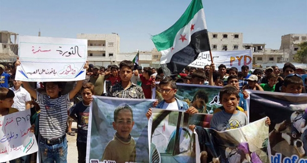Suriye'nin El-Bab, Azez ve Cerablus bölgelerinde halk, düzenledikleri gösterilerle terör örgütü PYD/PKK'nın zorla gasp ettiği bölgelerden çıkmasını istedi.