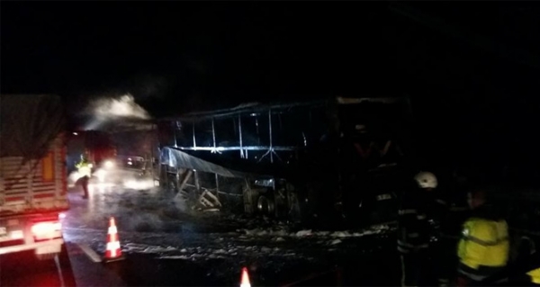 Bursa'da, otobanda meydana gelen kazada demir bariyere çarpan otobüs alev alıp küle döndü.