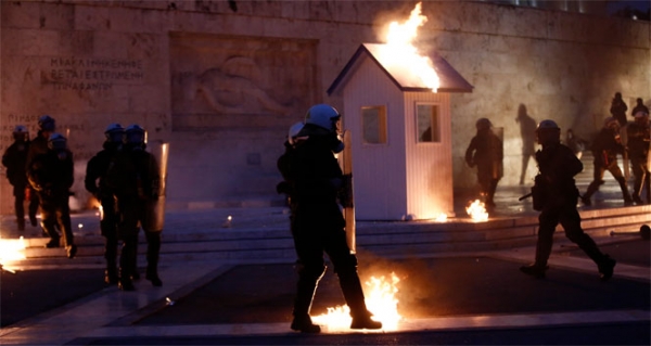 Yunanistan’da Hükümetin kemer sıkma politikalarına karşı protestolar devam ediyor. Yunan Parlamentosu önünde toplanan göstericiler, parlamento önünde bulunan polis kulübesine molotofkokteyli ile saldırdı. Göstericiler, göz yaşartıcı gaz ile müdahale eden polislere taş ve sopalarla karşılık verdi.